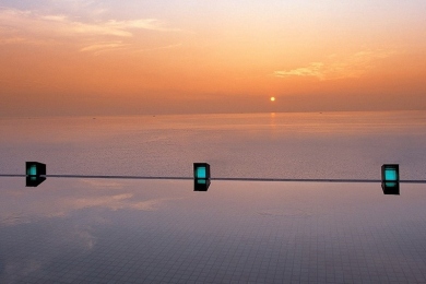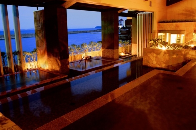 空へ誘うインフィニティバス、波打ち際の露天風呂。