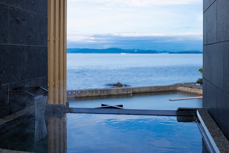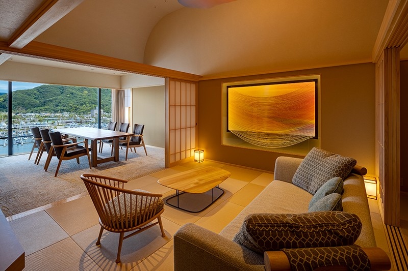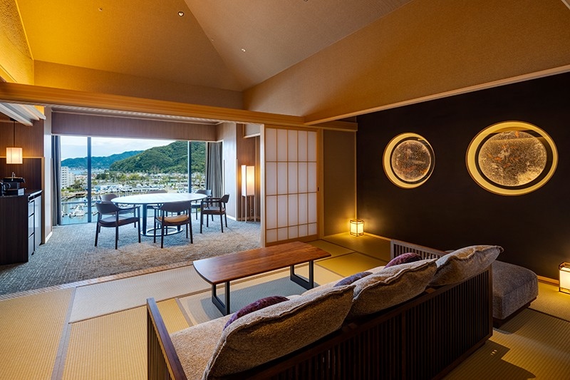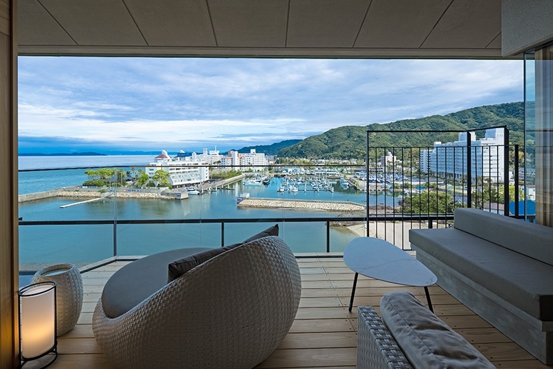 広さと開放感のある高い天井が印象的な客室は、陽光が降り注ぐ明るいリビングダイニングやゆったりと自由気ままに過ごせる広々とした和室、寝心地抜群のベッドルームのほか、専有の露天風呂付テラスを備えています。客室からの眺望もまさに特等席と呼ぶにふさわしく、海を見ながら温泉に浸かる専有露天風呂だけでなく、室内の大きな窓からもヨットハーバーの向こうに紀淡海峡を望む旅情あふれる景色をご覧いただけます。