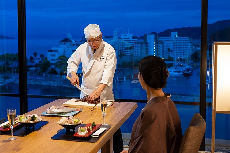 ご夕食には、目の前で料理人が捌く新鮮なお造りをはじめとして、地元漁港から届く新鮮な海の幸やご当地牛・淡路牛も愉しめるこだわりの日本料理をご堪能ください。